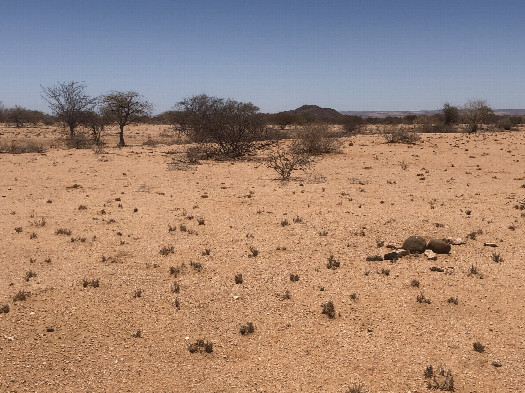 When I reached the turnoff to the confluence, the sun was exactly in the zenith (15E at 1 PM, 21S on DEC 15th). The confluence is 7 km from the gravel road M76 (“M” stands here certainly not for “Motorway”) between Khorixas and Uis, but a sandy track leads up to a distance of 1.4 km to the confluence point. Cycling on that track was a little crazy, because thorns threatened to flatten my tires, sand slowed me partially down to walking speed and the sun was as intense as she can be. I abandoned my bike under a tree in 1.4 km distance and walked the rest.