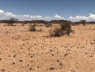 The confluence is covered with bare grit (sand and gravel), but from the stubbles you can tell, that there is high grass after rain: see how it looks in April when Babs and Helmut visited the point. Besides the stubbles, there are some scattered Arcadia trees. The stone cross laid on the ground by the first visitors 2004 is still unchanged.