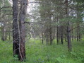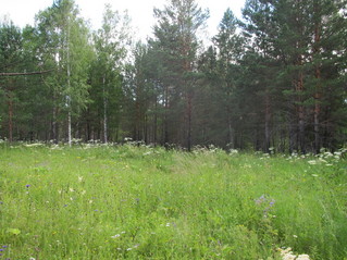 Having drove along the road towards Safronovka village we turned onto a side dirt road. Then we meandered on the field, forded Tayshetka river, which looked as a wide brook here. 400 m after the ford the road began to go away from the confluence. We tried to drive directly onto the field, but soon the grass became higher then cowl that resulted to zero visibility. Further on we walked about 300 m, breaking through the thicket of different grass of man's height. Finally at 20:35 we found the confluence spot on the edge of a small clearing in a mixed (of aspen and birch) forest.