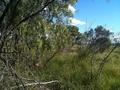 As we drove down it, we passed a few horses and cattle and an old beat up truck. After a few kilometers, we were surprised to see that the dirt track we were on was still going straight to the confluence point. Once we were about 300 m away from it, we arrived at the homestead of the property, where there was a house, a corral, a shed, a few vehicles, but not much activity at 4:45 pm. Ross, the ranch hand, was home and said he was winding down for the day. I explained why were there and asked for permission to go find the exact point. He said that was fine, but declined to go with us. We walked through an open gate between the corral and the shed and then through a closed gate beyond that one. It wasn't that hard to locate the exact point, which is on the edge of a creek/drainage. The point is covered with knee-high grasses and trees line the creek. Power lines are about 20-30 m to the west. Julie and I took our pictures and walked back to the house.