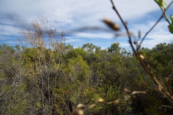 04-Dec-2014 -- I had been looking forward to visiting this confluence point, because it involved some hiking, but - unlike so many WA confluence points - wasn't just in a farm field. I knew - from satellite imagery - that I should start from the dirt road that heads east - from the Indian Ocean Road - at 29.97599°S 114.97767°E. When I got to this road, I could tell that at least parts of it were likely to be too sandy for my 2WD rental car, so I parked at the start and began hiking. Fortunately, it was a mild day, with temperatures in the low 20s °C - and also exceptionally windy, which I enjoyed, because it kept the flies away!