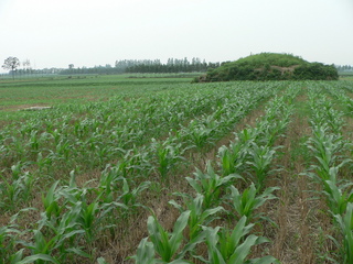 The ancient burial mound is a few dozen metres further on to the north, and we do a circumnavigation of it, stopping to chat with one of the poison sprayers, who tells us a bit of the history. He explains that, impressive though it is, this is in fact only the "rear mound" of a grave; the main mound, which was much bigger, was levelled back around the time of Liberation (1949) to make way for more crops.