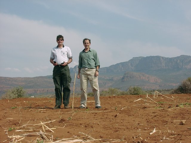 In the meantime Rienie had finished her first interviews, so we had to drive back to Bochum to take her to Blouberg hospital. At one o'clock Ferdi and I could leave on the second part of our adventure - the Confluence at 23S 29E on the other side of the mountain about 90 kilometres away. This we eventually reached at half past two, after asking directions a few times. The Confluence lies just north of the Blouberg in a fallow mealie field just north of Glenferness. We could drive to within 350 metres, and then had an easy walk along a footpath to the Confluence itself.