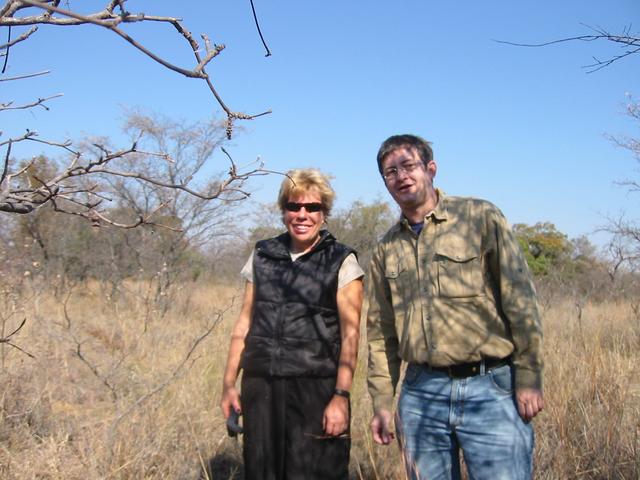 Once behind the fence, we established that the Confluence was only 400 m to the East from were we stood. The area was grassy, flat and littered with small trees and scrub, which grew in hard, baked clayey soil. Fairly sized termite mounds interrupted the monotony of the otherwise featureless plain and a few of the trees stuck out with conspicuous evergreen splendour in the otherwise dusty wintry landscape. We stumbled into the scrub cross-country. The ground was littered with burrows of all sizes, giving away the secret of an abundant wild life to the observer and we tried to make guesses of which animals would sleep the day away in the safety of their burrows. In less than 15 minutes we were able to locate the Confluence 24S 28E and proceeded with the mapping, taking photos of GPS and surroundings, which we attach herewith.