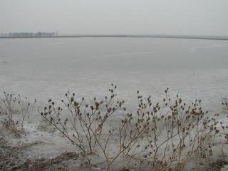 The Tianjin confluence point, as discovered by the first team of visitors, was located almost in the middle of a large fishpond (a square pond about 200 meters each side). The main difference now was that everything was frozen, and the point was an easy one-minute walk from the bank. Sierra and Anny took the lead to the point, which is about 80 meters from the nearest bank (the Ketterners were close). The ice was so smooth it would have been perfect for skating.
