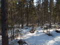 31-Mar-2012 – I set off from “Tourist” hotel in Krasnoyarsk city at about 3 pm. Hotel is on the right bank of Yenisey river. As soon as I crossed the bridge I got into the traffic jam (due to spring road works). Having torn myself from the city, I headed to the North towards Lesosobirsk city. I had to drive about 100 km till the confluence 57°N 93°E. Just after Malyi Kantat village I turned to the left from the asphalted road onto a gravel road towards Aitat village (Bolshemurtinsk district, Krasnoyarsk Territory), it was 15 km to that village. I stopped in 2 km before village entrance, so GPS pointed beeline distance 223 m! Further on I put on special high boots (a part of military chemical-protection suit) and walked 150 m onto snow-covered field and the rest distance – through wind-fallen trees. The confluence point is located in the forest among spruces, birches and aspens. Three is an extended field (maybe ploughed) in 5 metres to the east.