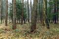 I park the car close to the monument that is already described by my predecessors; it is right at the edge of the road, at about 200 m to the confluence according to WGS84 system. It's still raining and the ground in the forest is very wet with many puddles around.