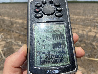 After I reached Nickerson, I made an arc around the west side of Hutchinson, and then anticipation rose as I left US 50 at Mohawk Road, traveled south on this gravel road to Morgan Ave, and then west to just after the 98th Meridian. I parked and gathered GPS, hat, and other necessary supplies. Looking north I realized my good fortune: No fences, and nothing had been planted. Even so, I stepped gingerly to avoid crunching any corn stalks. The field was dry, and it was getting a bit warm out, but still pleasant. Last year's corn crop remains were left in the fallow field, and it was an easy 5 minute walk north-northeast to the confluence point.
