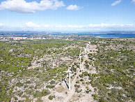 However, I found that the gravel access road (for the wind turbines) was easy to drive in my rental car (provided that I steered around the numerous puddles that had been left by earlier rain). The access road passed just 50m West of the point, leading to a trivial hike to reach the point, which lies in a flat, rock-strewn area, near the wind turbines. At the time of my visit, there was a strong wind from the North. This caused my drone difficulties, yet most of the wind turbines were not moving. (Perhaps the demand for electricity was too low at the time.)