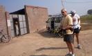 We eventually got to a spot that was as close as we could get on the road, and found a good place to pull off, about 800 meters from the confluence. It appeared to be an abandoned metalworking factory -- four cinderblock walls made a courtyard and a few sheets of corrugated tin in the corner made some shade. Seemed like a safe place to park next to. As we were getting the bikes off the roof, an old man with a long beard came up the road carrying a terracotta pot of water on his head. We greeted him (about all I can say in Hindi is "greetings," "thank you," and "this is a pen. The pen is on the desk." So far, only the first two have come in handy.) He seemed puzzled but not unfriendly, and walked past us into the cinderblock courtyard, which was apparently his home.