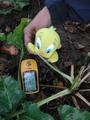 Besides Wolfgang and me a travelbug named Tweety joins us. We found him in a geocache right at the confluence 55N 15E. He really travels now! This confluence is at the border of a field under tall trees.