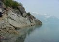 From studying the maps, we could tell only that the CP was above the high tide line and below 100 feet elevation. From about ¾ mile out, we began to get better idea of exactly where our destination lay [Photo 9]. But would we face steep rock or thick alder bush? Actually, it turned out to be some of each. With the CP to our right, we pulled up onto a fairly large protected beach [Photo 14], and found the point to be a little over 20 meters above us [Photo 10]. We located a natural path in a diagonal fissure heading up from the beach [Photo 9]. After that it was bushwhacking through the tangle of alder. I headed to the right. Steve correctly guessed the easiest route was to the left, and reached the point first [Photo 6]. Even with haze in the distance, the views to the east and south were worth the trip. After subdued celebration, we returned to the ‘yak and recrossed Tarr Inlet to reunite our party.