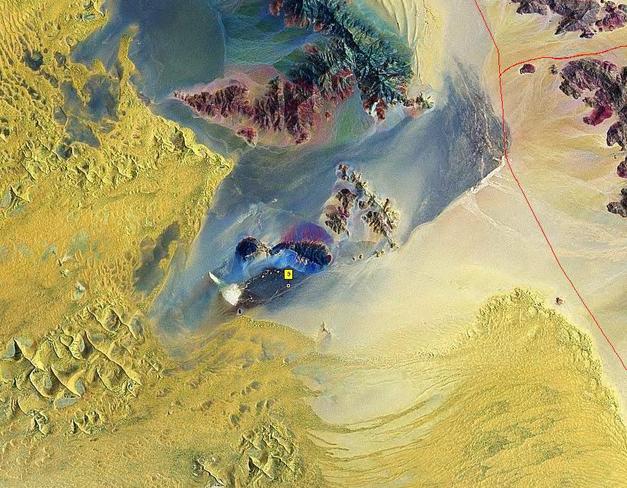 #2: A LandSat7 satellite view of the Confluence with our tracks passing on the D707.