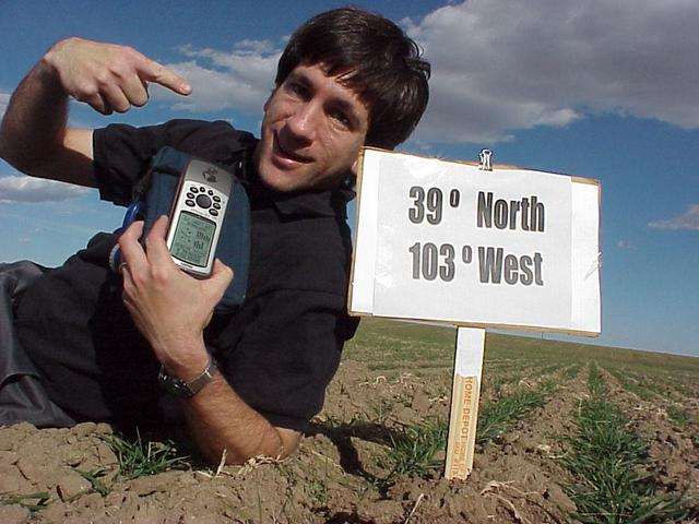 #9: Joseph Kerski, lying in the field, at the confluence site.